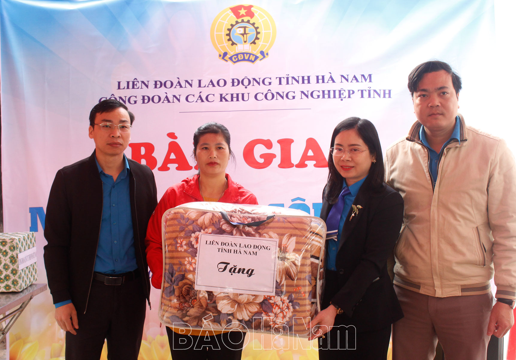 Đại diện Công đoàn Công ty TNHH NMS Việt Nam trao quà chúc mừng gia đình chị Đỗ Thị Thanh Hương.