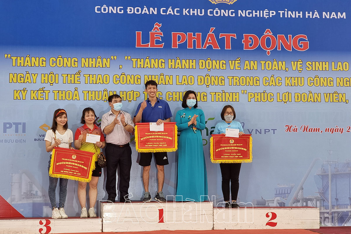 Lãnh đạo LĐLĐ tỉnh, Công đoàn các KCN tỉnh trao giải cho các đội có thành tích xuất sắc ở bộ môn chạy tiếp sức.