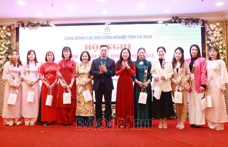 Tại hội nghị, lãnh đạo LĐLĐ tỉnh, Công đoàn các KCN tỉnh cùng các đại biểu khách mời đã tặng hoa và quà chúc mừng toàn thể chị em nhân kỷ niệm Ngày Quốc tế Phụ nữ 8/3.