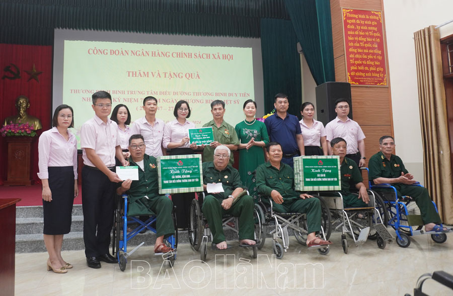 Kỷ niệm 77 năm Ngày Thương binh - Liệt sĩ (27/7/1947-27/7/2024), chiều ngày 22/7, Công đoàn Ngân hàng Chính sách Xã hội (NHCSXH) Việt Nam đã ủy quyền cho Công đoàn cơ sở Chi nhánh NHCSXH tỉnh Hà Nam tổ chức thăm, tặng quà thương bệnh binh (TBB), cán bộ, Trung tâm nuôi dưỡng thương bệnh binh nặng và điều dưỡng người có công tỉnh Hà Nam, Trung tâm Điều dưỡng thương binh Kim Bảng, Trung tâm Điều dưỡng thương binh Duy Tiên.