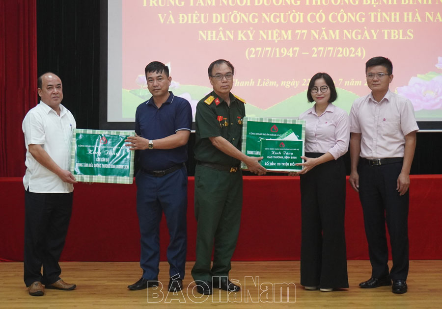 Tại các trung tâm, đại diện Ban Giám đốc, Công đoàn Chi nhánh NHCSXH tỉnh Hà Nam đã thay mặt Công đoàn Ngân hàng Chính sách Xã hội Việt Nam ân cần thăm hỏi, bày tỏ lòng biết ơn sâu sắc tới các TBB đã cống hiến hy sinh trong công cuộc đấu tranh, giải phóng đất nước. Nhân dịp này, Công đoàn NHCSXH Việt Nam đã tặng các TBB mỗi trung tâm 20 triệu đồng và một phần quà; Công đoàn cơ sở NHCSXH tỉnh tặng các TBB mỗi trung tâm 5 triệu đồng và một phần quà tặng cho cán bộ, nhân viên nuôi dưỡng TBB và điều dưỡng người có công.