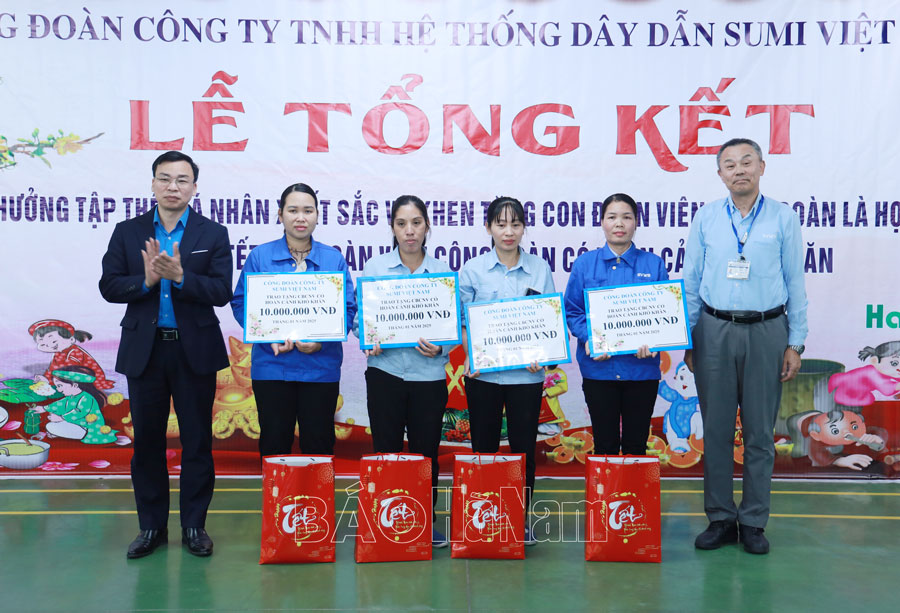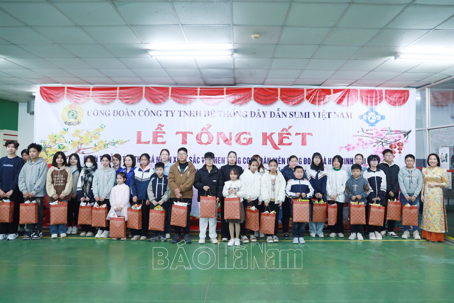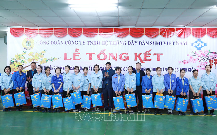 Công đoàn Công ty TNHH Hệ thống dây dẫn Sumi Việt Nam, KCN Đồng Văn II (thị xã Duy Tiên) vừa tổ chức tổng kết hoạt động công đoàn năm 2024, triển khai nhiệm vụ năm 2025; khen thưởng tập thể, cá nhân xuất sắc và tặng quà con đoàn viên là học sinh giỏi, tặng quà Tết cho đoàn viên có hoàn cảnh khó khăn.