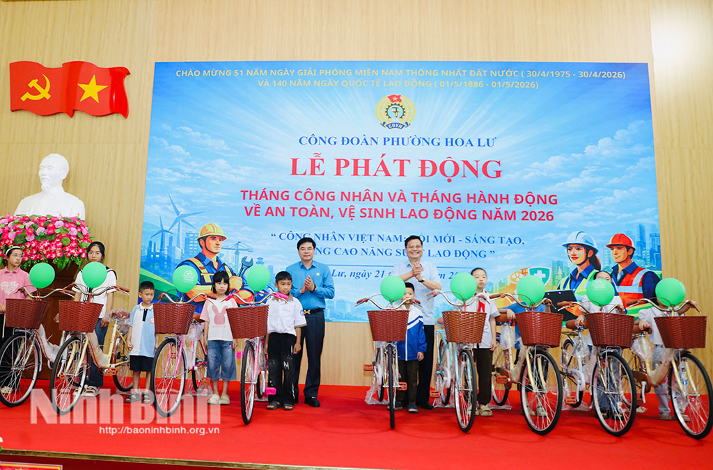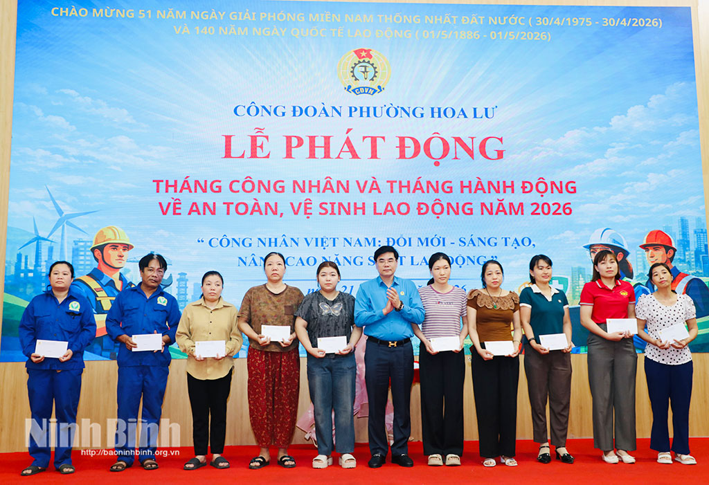 Ngày 21/4, Công đoàn phường Hoa Lư tổ chức lễ phát động Tháng Công nhân, Tháng hành động về an toàn, vệ sinh lao động (ATVSLĐ) năm 2026. Dự chương trình có các đồng chí Tỉnh ủy viên: Nguyễn Hải Long, Phó Chủ tịch Ủy ban MTTQ Việt Nam tỉnh, Chủ tịch LĐLĐ tỉnh; Bùi Thành Đông, Bí thư Đảng ủy, Chủ tịch HĐND phường Hoa Lư.