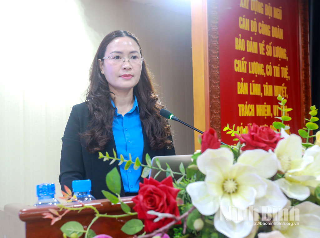 Đồng chí Lê Thị Hoa, Phó Chủ tịch LĐLĐ tỉnh phát biểu tại hội nghị.