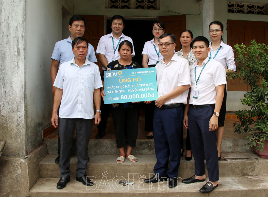 Lãnh đạo Công đoàn Chi nhánh BIDV Hà Nam trao tiền hỗ trợ cho nông dân xã Tân Sơn.Lãnh đạo Công đoàn Chi nhánh BIDV Hà Nam trao số tiền 80 triệu đồng hỗ trợ bà Nguyễn Thị Nhiên, thôn Do Lễ, xã Liên Sơn sửa nhà.