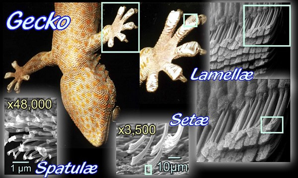 Một ví dụ khắc với loài tắc kè trong dự án nghiên cứu một thiết bị đi trên tường của nhóm nghiên cứu Robert Full tại đại học Berkeley. Các nhà khoa học đã phát hiện ra rằng, mỗi ngón chân của tắc kè được bao phủ bởi một lớp lông có kích thước siêu nhỏ, giúp chúng có thể bám dính vào các bề mặt mịn theo lực van der Waals (độ bám dính giữa các phân tử). Mô phỏng điều đó, các nhà khoa học cũng tạo ra những miếng đệm với lớp ống nano siêu nhỏ mà có thể hỗ trợ những người leo núi bám tốt hơn trên các vách đá.