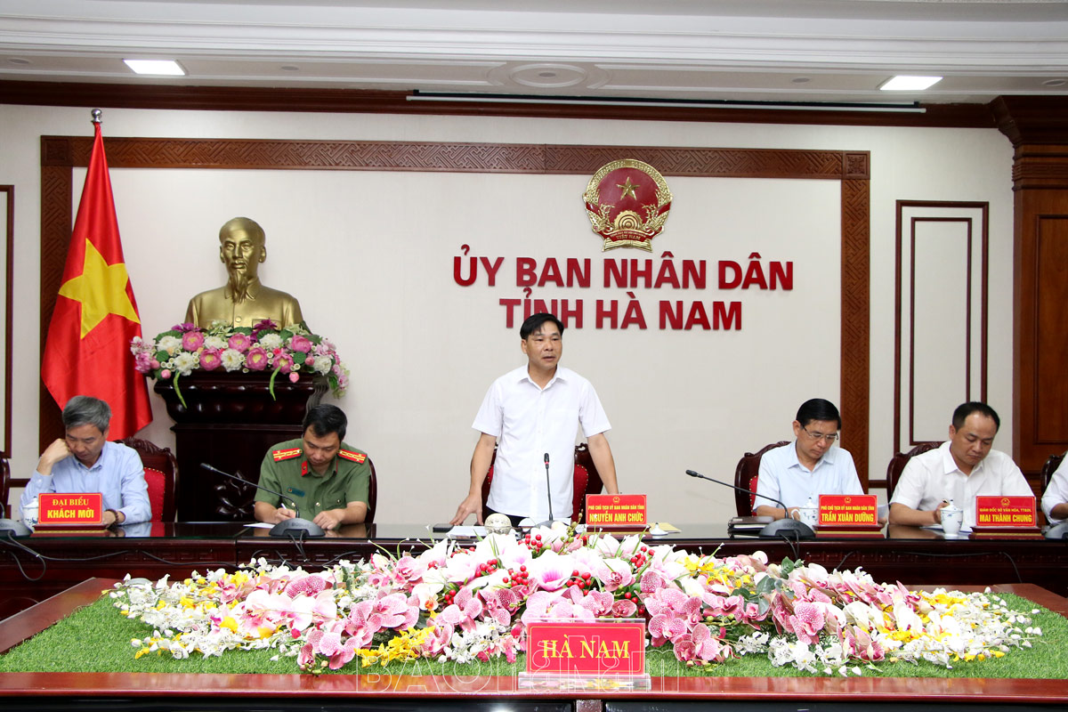 Sáng 9/5, UBND tỉnh tổ chức hội nghị nghe báo cáo công tác tổ chức Tuần Văn hóa - Du lịch Hà Nam năm 2023, chương trình giao lưu biểu diễn nghệ thuật truyền thống văn hóa Việt Nam – Nhật Bản và lễ khởi công Dự án đầu tư xây dựng nút giao Phú Thứ và tuyến đường kết nối tại xã Tiên Hiệp, thành phố Phủ Lý; Lễ khánh thành Khu phức hợp thể thao xã Tượng Lĩnh, huyện Kim Bảng. Đồng chí Nguyễn Anh Chức, Ủy viên BTV Tỉnh ủy, Phó Chủ tịch Thường trực UBND tỉnh chủ trì hội nghị.