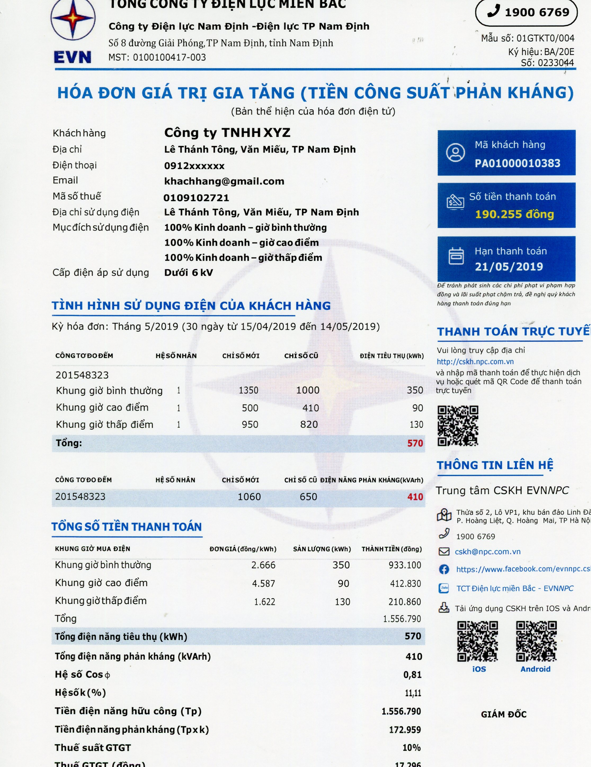 Công ty Điện lực Nam Định xin trân trọng thông báo tới Quý Khách hàng, bắt đầu từ 1/3/2020, Tập đoàn Điện lực Việt Nam áp dụng mẫu hóa đơn điện tử mới bao gồm 3 loại: hóa đơn tiền điện cho mục đích sình hoạt, ngoài sinh hoạt và hóa đơn tiền công suất phản kháng.
