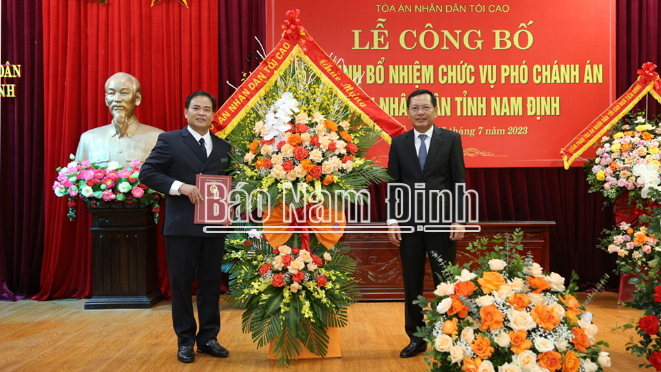 Ngày 25-7, Tòa án nhân dân (TAND) tối cao tổ chức lễ công bố Quyết định bổ nhiệm chức vụ Phó Chánh án TAND tỉnh Nam Định. Dự hội nghị có đồng chí Nguyễn Văn Du, Phó Chánh án TAND tối cao; Nguyễn Phùng Hoan, Uỷ viên Ban TVTU, Phó Chủ tịch Thường trực HĐND tỉnh.