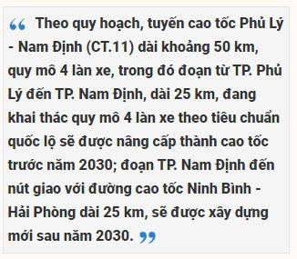 Cần phải nói thêm rằng, tại Tờ trình số 34/TTr-UBND ngày 12/4/2024, UBND tỉnh Nam Định đề nghị Thủ tướng Chính phủ cho phép tỉnh này lập Báo cáo nghiên cứu tiền khả thi Dự án Xây dựng tuyến đường cao tốc Phủ Lý - Nam Định.