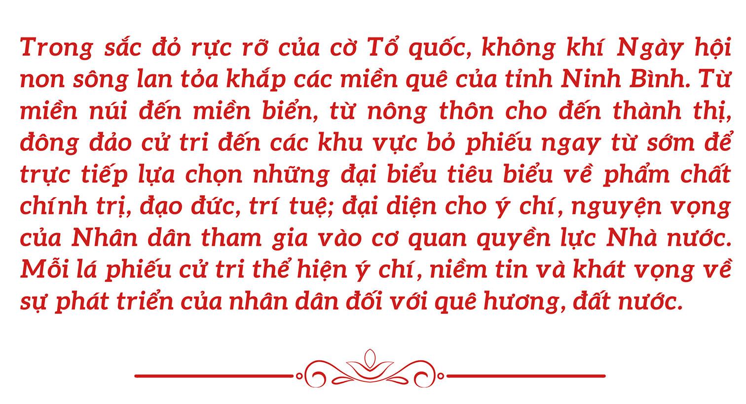 Hơn 3 triệu cử tri Ninh Bình trong cuộc bầu cử đại biểu Quốc hội khóa XVI và đại biểu HĐND các cấp nhiệm kỳ 2026-2031 không chỉ thể hiện quyền dân chủ của công dân, là niềm tin, kỳ vọng của gửi gắm vào các đại biểu dân cử, mà còn là một minh chứng của tinh thần đoàn kết, trách nhiệm của Nhân dân trong tỉnh, góp phần xây dựng chính quyền vững mạnh, hoạt động hiệu lực, hiệu quả vì lợi ích của Nhân dân.