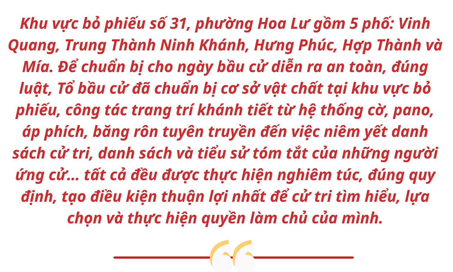Là phường trung tâm, trọng điểm của tỉnh, Hoa Lư có 58 điểm bầu cử với trên 100.000 cử tri tham gia bỏ phiếu. Tại các điểm bỏ phiếu trên địa bàn phường, an ninh trật tự được đảm bảo, cùng sự chuẩn bị chu đáo, đồng bộ và tinh thần trách nhiệm cao của cả hệ thống chính trị, đông đảo cử tri trong tỉnh đã có mặt ở các khu vực bỏ phiếu thực hiện quyền và nghĩa vụ của công dân, ai ai cũng vui mừng, phấn khởi chờ đón giây phút được tự tay bỏ lá phiếu bầu chọn những đại biểu xứng đáng vào Quốc hội và HĐND các cấp.