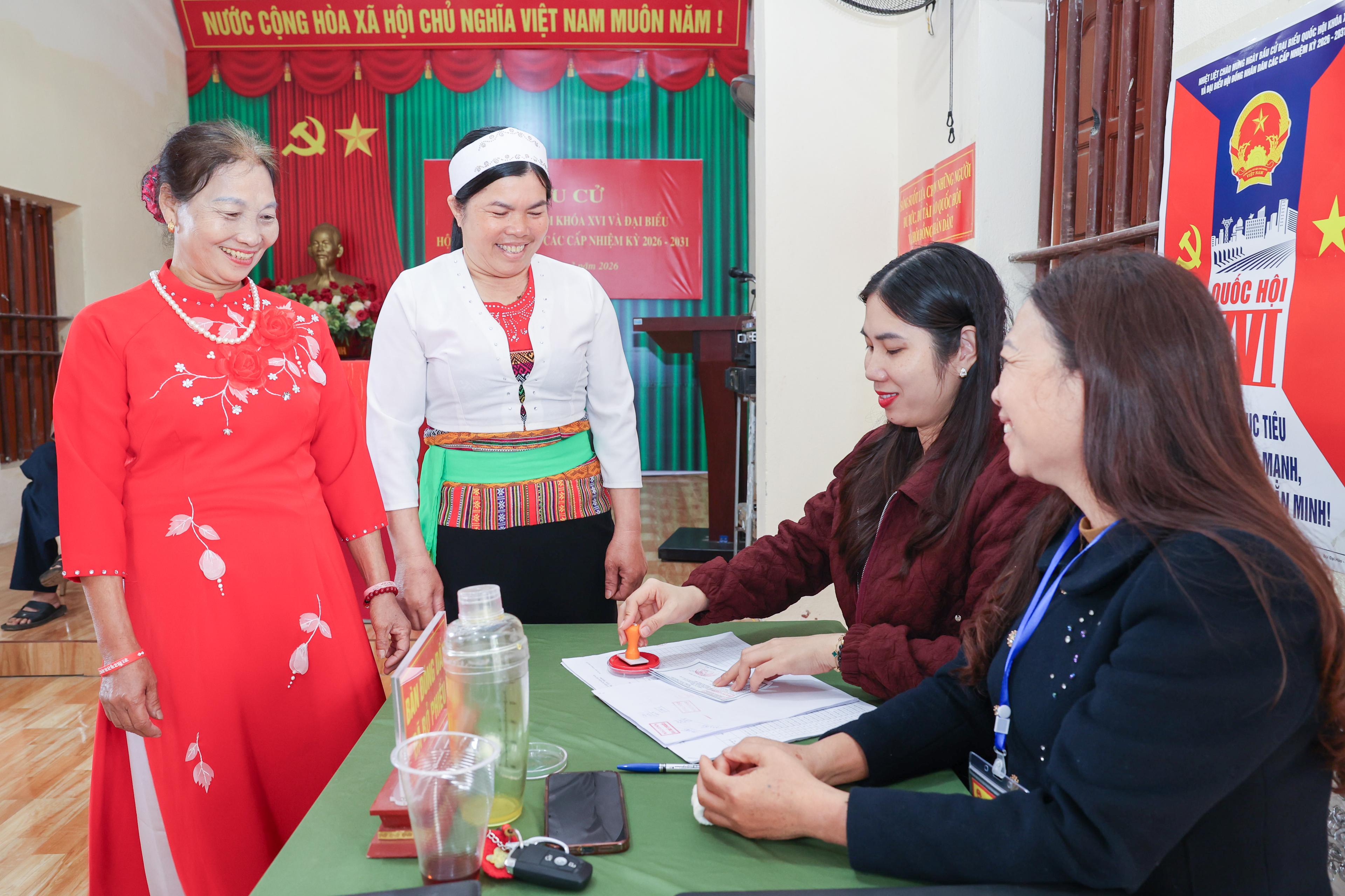 Tại những địa bàn có đông đồng bào dân tộc Mường sinh sống trên địa bàn tỉnh, không khí ngày hội non sông càng thêm tưng bừng, rộn ràng. Xen trong dòng người nô nức đến các khu vực bỏ phiếu là âm thanh cồng chiêng vang vọng, là âm thanh quen thuộc, thiêng liêng trong những ngày hội lớn của đồng bào Mường. Âm thanh đó như hòa cùng niềm vui, niềm tự hào của bà con khi thực hiện quyền và nghĩa vụ công dân, góp phần làm nên sắc màu sinh động của ngày hội non sông. Trong bộ trang phục truyền thống rực rỡ của các thiếu nữ Mường, chị Bùi Thị Huyên ở tổ dân phố An Ngải, phường Yên Sơn cầm trên tay lá phiếu cử tri hân hoan đi bầu cử. Chị mong muốn các đại biểu được nhân dân tin tưởng, lựa chọn qua cuộc bầu cử này thực sự tận tụy, trách nhiệm, hết lòng vì nước, vì dân; đặc biệt là quan tâm đến những chính sách phát triển, nâng cao đời sống của nhân dân, nhất là vùng đồng bào dân tộc còn khó khăn.