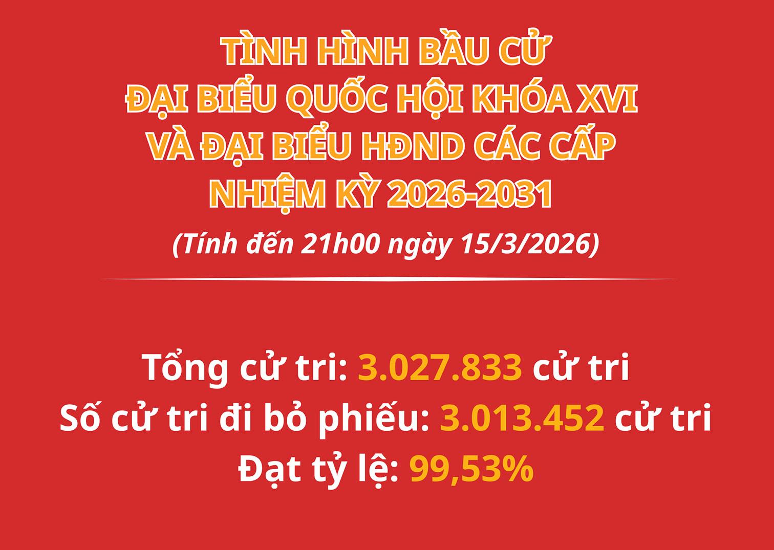 Theo báo cáo nhanh của Ủy ban Bầu cử tỉnh, trong ngày 15/3/2026, có 129/129 xã, phường thực hiện việc bầu cử đảm bảo đúng quy định, không có phát sinh các tình huống ngoài quy định của Luật. Tính đến 21h00, sơ bộ có 3.013.452/3.027.833 cử tri trên địa bàn tỉnh tham gia bỏ phiếu bầu đại biểu Quốc hội khóa XVI và đại biểu HĐND các cấp nhiệm kỳ 2026-2031, đạt tỷ lệ 99,53%. Có 21 xã, phường trên địa bàn tỉnh có 100% cử tri trong danh sách cử tri tham gia bỏ phiếu (gồm: Kim Bảng, Liêm Tuyền, Nguyễn Úy, Lý Thường Kiệt, Tam Chúc, Trung Sơn, Trường Thi, Cúc Phương, Đồng Thái, Gia Lâm, Giao Ninh, Khánh Hội, Khánh Trung, Kim Đông, Liêm Hà, Nho Quan, Phú Long, Tân Thanh, Thanh Bình, Thanh Liêm, Yên Mô), với 1.337/2.536 khu vực bỏ phiếu có 100% cử tri trong danh sách tham gia bỏ phiếu.