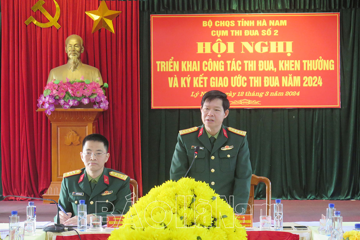 Phát biểu tại hội nghị, Đại tá Trịnh Hồng Phong, Chỉ huy trưởng Bộ CHQS tỉnh ghi nhận, biểu dương tinh thần thi đua của các đơn vị trong thực hiện phong trào TĐQT và công tác TĐKT thời gian qua. Đồng chí nhấn mạnh: Để phong trào thi đua tiếp tục đạt kết quả tốt hơn, các đơn vị trong cụm cần tăng cường đổi mới, sáng tạo trong thực hiện các nội dung thi đua; tìm giải pháp thực hiện cụ thể với nhiều nội dung đột phá, xây dựng quy chế thi đua chặt chẽ; đảm bảo việc khen thưởng, kỷ luật rõ ràng, thỏa đáng. Trong đó tập trung làm tốt chức năng tham mưu, chủ trì về công tác quân sự, quốc phòng địa phương; xây dựng thế trận khu vực phòng thủ; xây dựng lực lượng dân quân tự vệ vững mạnh; xây dựng lực lượng dự bị động viên và công tác tuyển quân; làm tốt công tác diễn tập; hội thi, hội thao, giáo dục quốc phòng – an ninh; nắm tình hình địa bàn, vận động quần chúng; nâng cao tinh thần cảnh giác, phối hợp các lực lượng, sẵn sàng xử lý kịp thời những tình huống phứcc tạp nảy sinh, giữ ổn định tình hình…