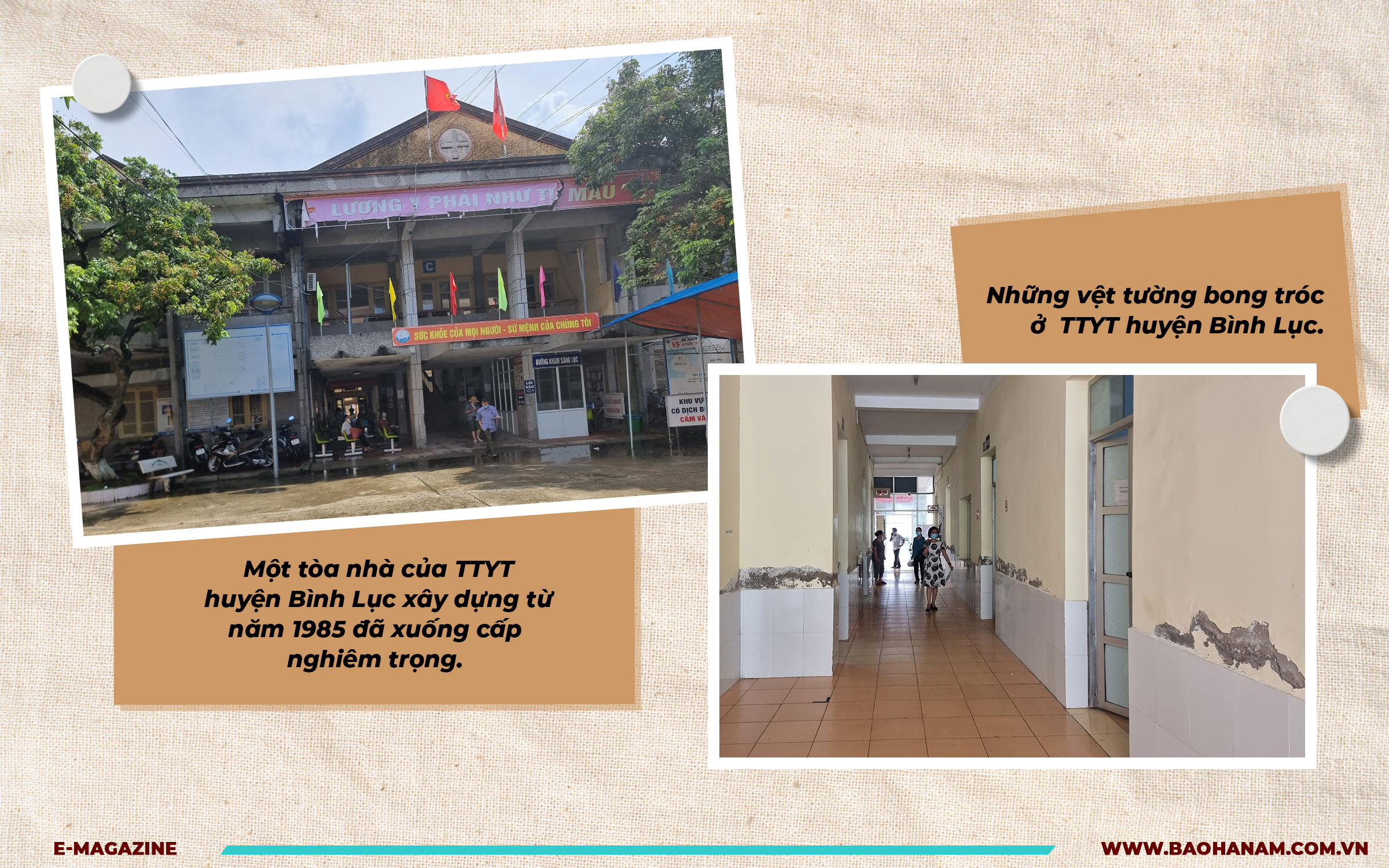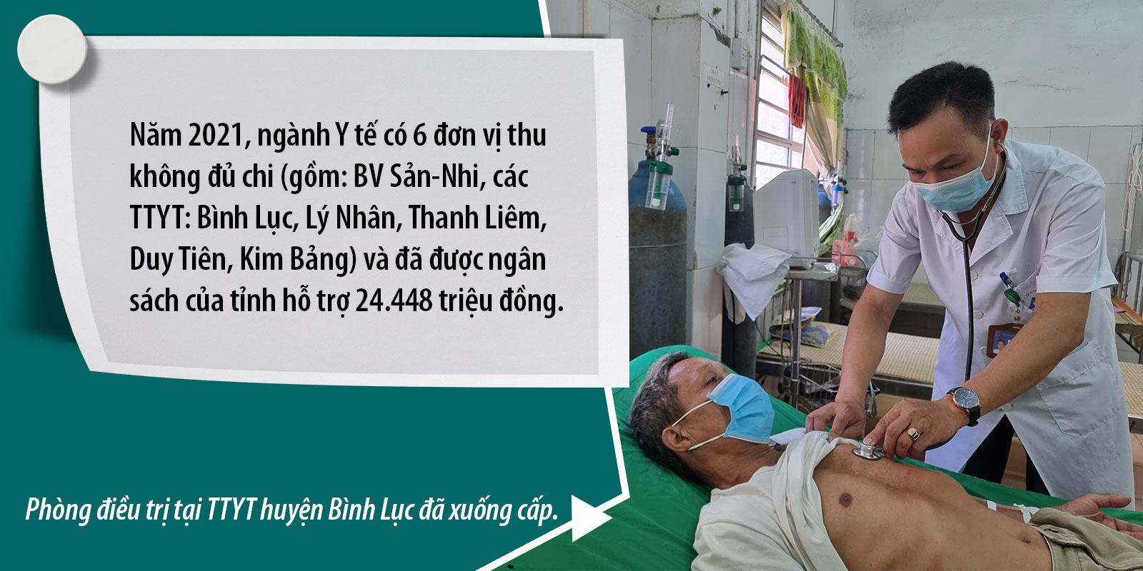Được xây dựng từ năm 1985, đến năm 2018 Trung tâm Y tế (TTYT) huyện Bình Lục mới được đầu tư gần 3 tỷ đồng cải tạo, sửa chữa. Do kinh phí hạn chế, việc sửa chữa tập trung vào khu vực nhà vệ sinh và các phòng bệnh. Khu khám bệnh của trung tâm hiện tại xuống cấp, tường ẩm mốc, bong tróc, thấm nước… Từ năm 2019, TTYT huyện thực hiện tự chủ một phần. Và chỉ không lâu sau đó, dịch bệnh Covid-19 xảy ra và kéo dài đến nay khiến số lượng người đến KCB tại trung tâm giảm đáng kể. Đặc biệt trong năm 2021, có những thời điểm lượng bệnh nhân điều trị nội trú giảm đến 60%, kéo theo nguồn thu giảm dẫn đến thiếu hụt kinh phí chi trả lương và các khoản phụ cấp cho cán bộ, viên chức nên phải xin ngân sách nhà nước cấp bù. Theo tính toán, nguồn thu của bệnh viện trong 2 năm dịch Covid-19 (2020, 2021) giảm hơn 15% so với thời điểm trước dịch.