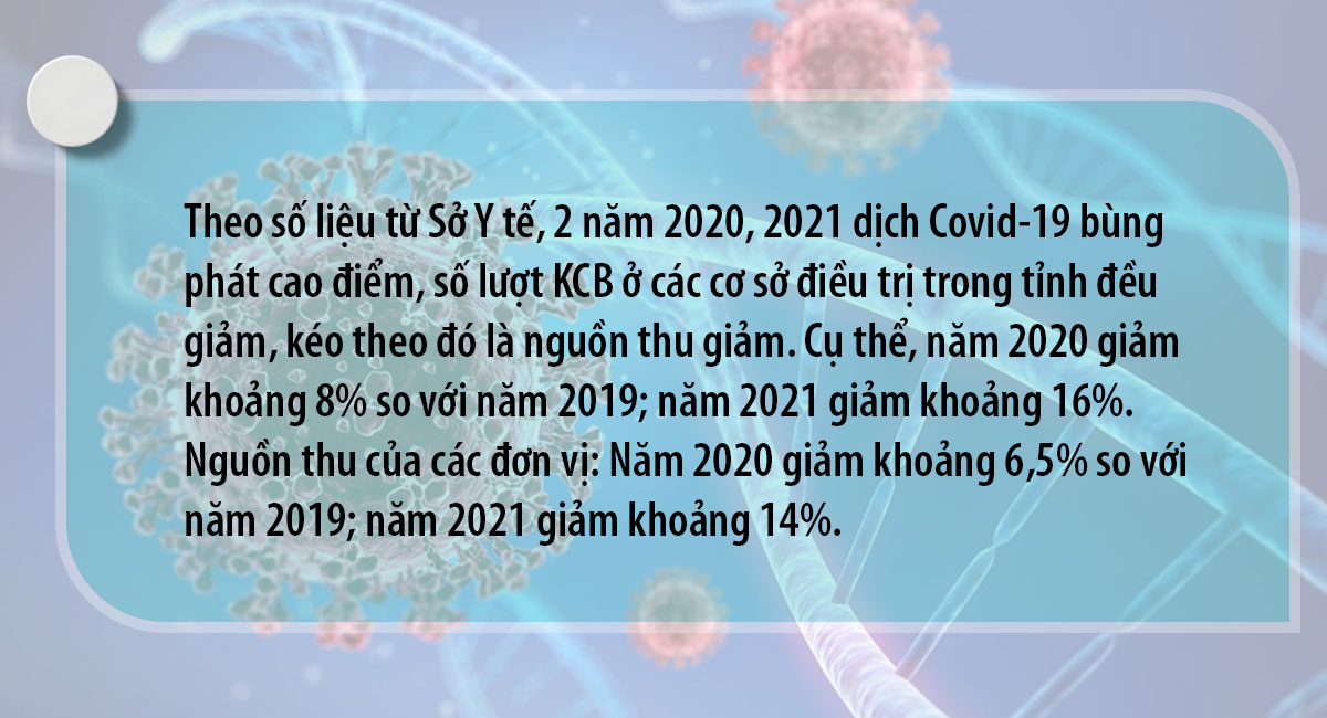 Trước khi có dịch Covid-19, cơ sở vật chất, trang thiết bị, đời sống cán bộ, nhân viên các cơ sở điều trị trong tỉnh đã gặp khá nhiều khó khăn. Hơn 2 năm xảy ra đại dịch, khó khăn càng tăng lên khi lượng người đến khám, chữa bệnh (KCB) giảm dẫn đến nguồn thu giảm, không có kinh phí tái đầu tư cơ sở vật chất, trang thiết bị, không có thu nhập tăng thêm trong khi cường độ làm việc của cán bộ, nhân viên y tế tăng gấp nhiều lần vì đảm nhiệm vai trò nòng cốt trong công tác phòng chống dịch (PCD). Vì thế, khi đại dịch được kiểm soát, dù số lượng người dân đến KCB đông trở lại nhưng các cơ sở điều trị khá chật vật trong việc phục hồi và phát triển, rất cần được sự hỗ trợ tích cực hơn nữa.