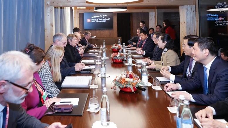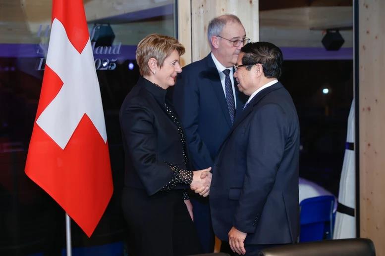 Thủ tướng trân trọng chuyển lời thăm hỏi và lời chúc mừng của Tổng Bí thư Tô Lâm, Chủ tịch nước Lương Cường, Chủ tịch Quốc hội Trần Thanh Mẫn tới Tổng thống Thụy Sĩ Karin Keller-Sutter. Bày tỏ vui mừng trở lại thăm Thụy Sĩ và tham dự Hội nghị WEF Davos, Thủ tướng Chính phủ Phạm Minh Chính nhấn mạnh Việt Nam luôn coi trọng quan hệ hữu nghị và hợp tác nhiều mặt với Thụy Sĩ.