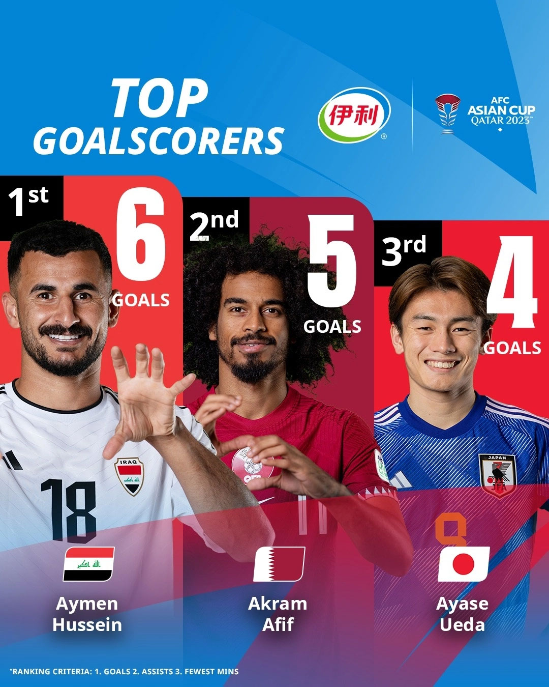 Akram Afif hiện còn kém người dẫn đầu trên bảng xếp hạng Vua phá lưới Asian Cup 2023 là Aymen Hussein của Iraq. Tiền đạo này ghi được 6 bàn thắng sau 4 trận, nhưng đã hết cơ hội nâng cao thành tích khi Iraq đã bị loại.