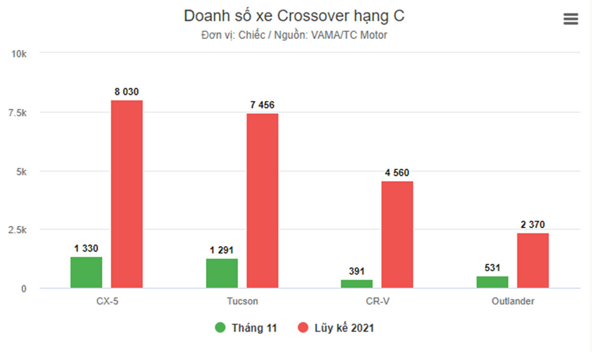 Doanh số tháng 11 của phân khúc crossover cỡ C chứng kiến sự phân hóa thành hai tầng. Ở tầng trên, Mazda CX-5 bán 1.330 xe, Hyundai Tucson là 1.291 xe. Trong khi ở tầng dưới, Honda CR-V bán 391 xe và Mitsubishi Outlander là 531 xe. Những mẫu xe khác trong phân khúc như MG HS, Peugeot 3008 không công bố số liệu bán hàng.