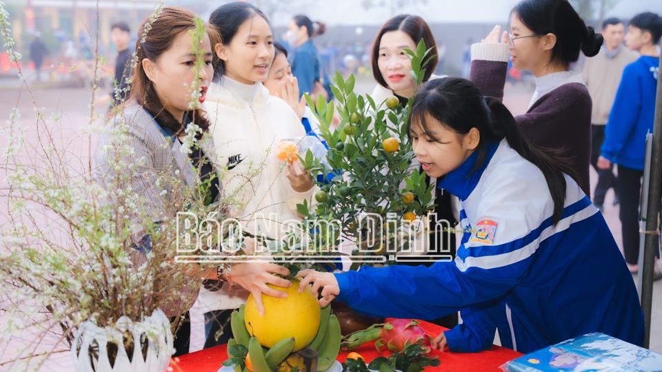 | Học sinh trường THCS Phương Định (Trực Ninh) tham gia trải nghiệm bày mâm ngũ quả ngày Tết. |