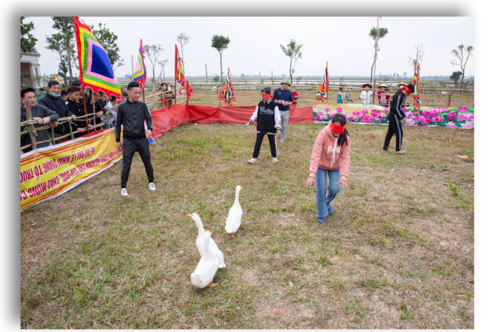 | Trò chơi bịt mắt bắt vịt trong phần hội chùa Hổ Sơn, xã Liên Minh (Vụ Bản). |