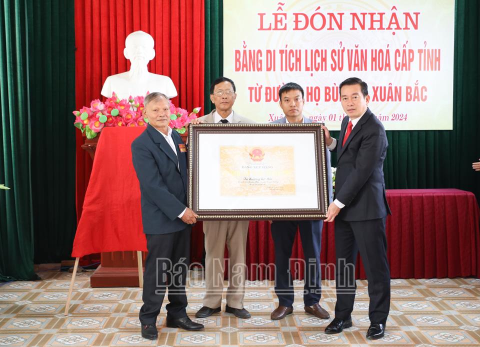 | Lãnh đạo UBND huyện Xuân Trường trao Bằng công nhận Di tích lịch sử - văn hóa từ đường Họ Bùi xã Xuân Bắc (Xuân Trường). |