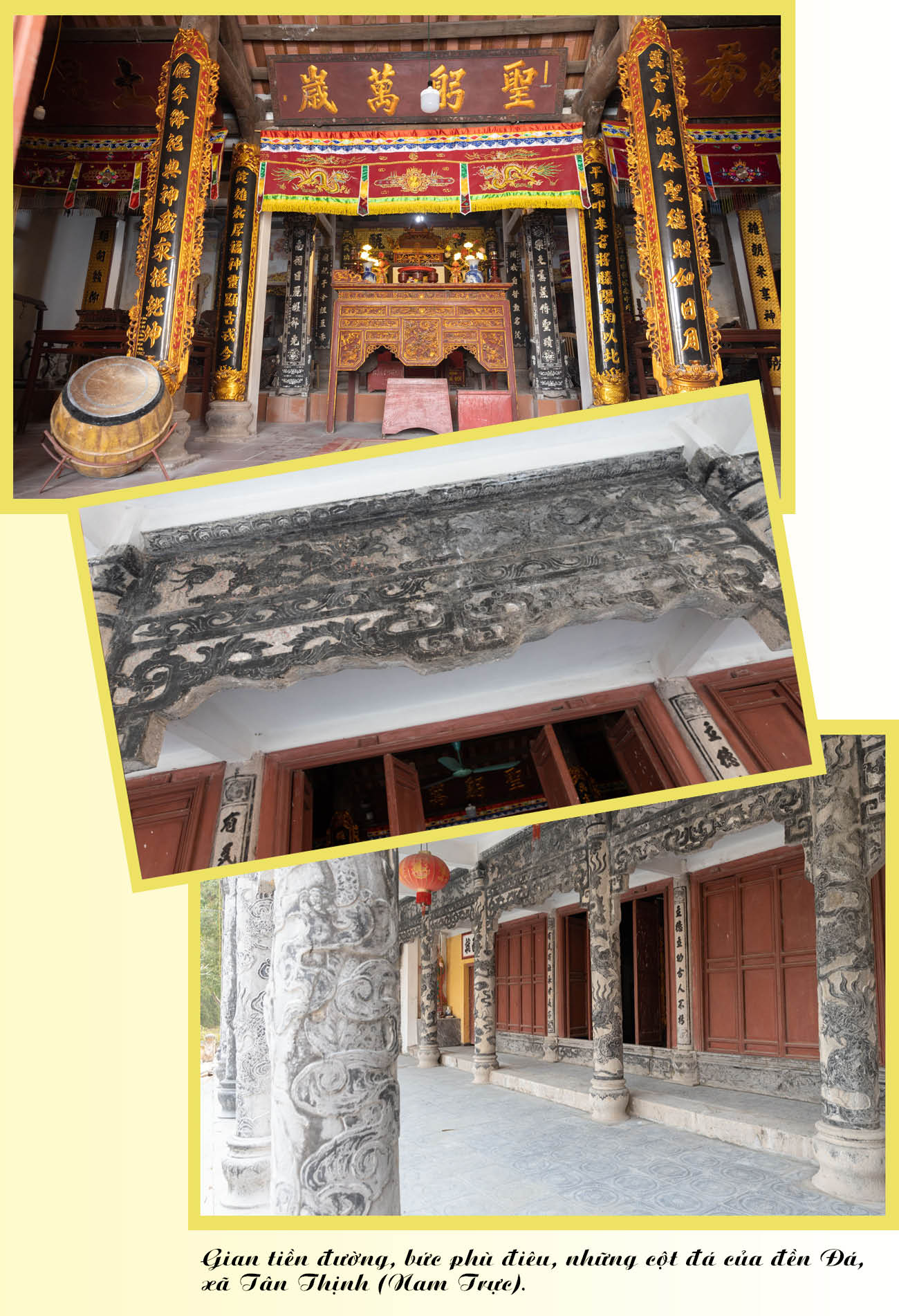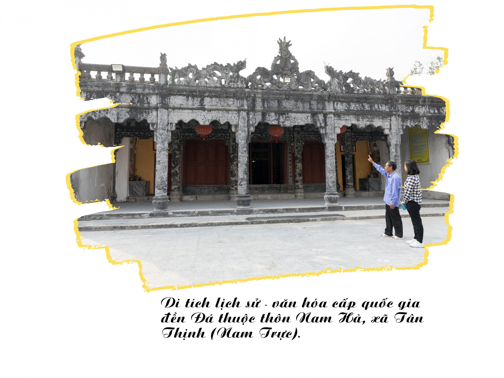 Di tích lịch sử - văn hóa cấp quốc gia Đền Đá thuộc thôn Nam Hà, xã Tân Thịnh (Nam Trực) là công trình đền thờ được xây dựng bằng đá theo phong cách kiến trúc thời Hậu Lê, thờ Vũ Uy Công thời Hùng Vương thứ 18. Đền được xây dựng gồm 4 tòa chính và tòa dải vũ ở phía bắc. Kiến trúc đặc sắc nhất của Đền Đá được thể hiện tại tòa bái đường được làm bằng đá gồm 5 gian xây dựng từ năm 1941-1943. Tất cả các cấu kiện như cột, xà, hệ thống cửa võng, các đấu trụ bằng đá khối được nghệ nhân dân gian tuyển chọn kỹ lưỡng. Tòa tiền đường được giữ bởi 8 cột đá, chân cột đặt trên trụ đá có họa tiết lá sen chạm khắc công phu. Nghệ thuật điêu khắc tài hoa của các thợ đá xưa thể hiện khéo léo khi tạc trên 8 cột đá những bức phù điêu rồng vờn mây, cá chép bơi lượn… Ngoài trụ, cột, mỗi gian bái đường đều tạo một bộ cửa võng bằng đá chạm khắc tỉ mỉ với mặt hổ phù, rồng bay, rồng cuốn nước. Phía trên các cửa võng được trang trí các họa tiết cánh sen, bầu rượu, cỏ cây, hoa lá sinh động. Tại Đền Đá còn lưu giữ nhiều hiện vật quý hiếm như: bộ bàn ghế đá, sập bằng đá...