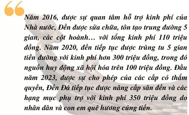 Những năm qua, các huyện Trực Ninh, Nam Trực, Xuân Trường, Vụ Bản, Ý Yên đã đẩy mạnh công tác tuyên truyền huy động các nguồn lực để bảo tồn, phát huy giá trị các di tích lịch sử - văn hóa. Phòng Văn hóa - Thông tin các huyện đã tích cực phối hợp với các tổ chức đoàn thể như: MTTQ, Hội Nông dân, Hội Phụ nữ, Đoàn Thanh niên, Hội Cựu chiến binh… triển khai các hoạt động bảo vệ, tôn tạo, phát huy giá trị các di tích lịch sử - văn hóa. Phòng Giáo dục và Đào tạo các huyện chỉ đạo các trường tiểu học và THCS tổ chức cho học sinh dọn vệ sinh, trồng hoa, cây xanh tại các điểm di tích; thường xuyên tổ chức cho học sinh tham quan tìm hiểu ý nghĩa, giá trị của các di tích lịch sử - văn hóa tại địa phương nhằm giáo dục truyền thống lịch sử - văn hóa và cách mạng của quê hương. Đoàn Thanh niên các địa phương đảm nhận chăm sóc, bảo vệ, trồng cây xanh tại các điểm di tích lịch sử - văn hóa trên địa bàn. Để bảo tồn, phát huy giá trị các di tích, ngoài nguồn vốn từ ngân sách xã, kinh phí từ các chương trình mục tiêu quốc gia, các địa phương đã tích cực vận động các tổ chức, cá nhân, doanh nghiệp chung tay góp công, góp của để tu bổ, tôn tạo các di tích lịch sử - văn hóa. Nhờ đó, các di tích lịch sử - văn hóa kiến trúc độc đáo bằng đá đều được trùng tu, tôn tạo đảm bảo chất lượng và giữ được nguyên vẹn kiến trúc di tích gốc. Trong đó, tiêu biểu là Đền Đá, xã Tân Thịnh từ năm 2016 đến nay đã trải qua nhiều lần tôn tạo. Ông Trần Thanh Cảnh, Trưởng ban quản lý di tích đền cho biết: