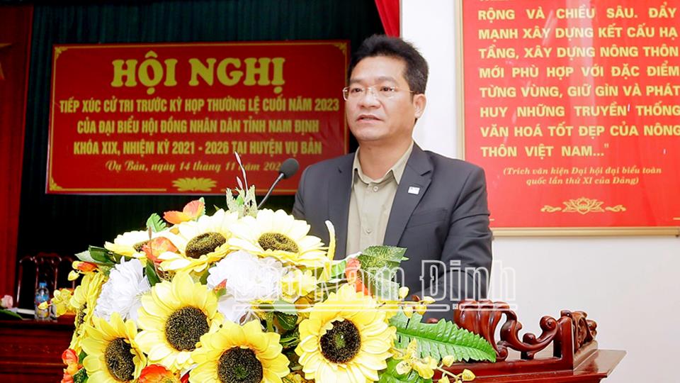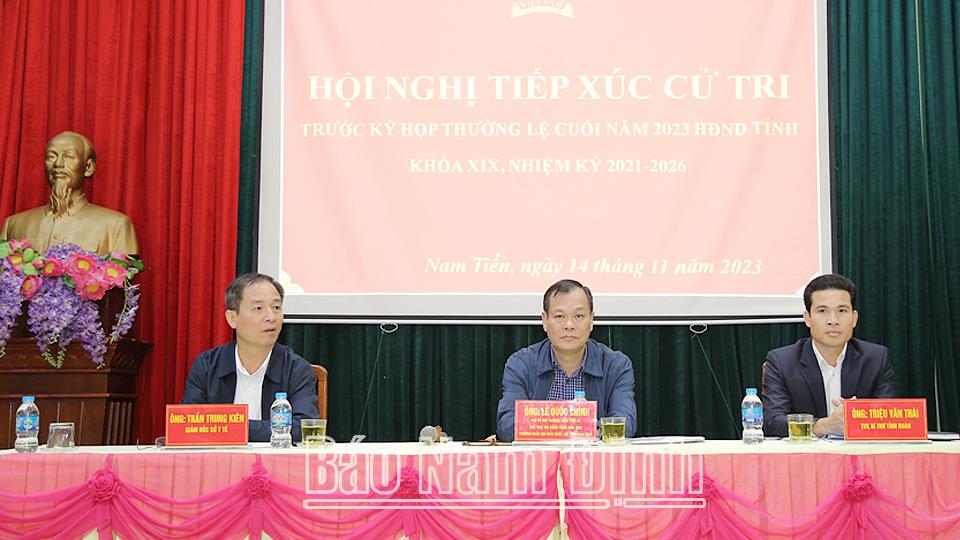 Phát biểu tại hội nghị tiếp xúc cử tri, đồng chí Lê Quốc Chỉnh, Phó Bí thư Thường trực Tỉnh uỷ, Chủ tịch HĐND tỉnh, Trưởng đoàn Đoàn đại biểu Quốc hội tỉnh và các đồng chí lãnh đạo tỉnh gửi lời cảm ơn tới các cử tri các địa phương trong tỉnh đã dành sự quan tâm tới việc thực hiện các nhiệm vụ phát triển kinh tế - xã hội, quốc phòng - an ninh của huyện, của tỉnh thông qua các ý kiến, kiến nghị tâm huyết, trách nhiệm; thông tin kết quả nổi bật về tình hình phát triển kinh tế - xã hội tỉnh Nam Định đạt được trong năm 2023; phương hướng, mục tiêu của tỉnh trong năm 2024. Đồng thời tiếp thu các ý kiến, kiến nghị của cử tri; làm rõ thêm một số nội dung cử tri quan tâm; ghi nhận các vấn đề cử tri phản ánh, kiến nghị để tổng hợp gửi đến cơ quan có thẩm quyền giải quyết và trả lời tại kỳ họp thường lệ cuối năm 2023 của HĐND tỉnh, khóa XIX. Các đồng chí mong muốn cử tri tiếp tục có thêm nhiều ý kiến, kiến nghị trên các lĩnh vực để HĐND tỉnh đề xuất, kiến nghị với các cấp, các ngành chức năng xem xét, giải quyết, góp phần thực hiện thắng lợi nhiệm vụ phát triển kinh tế - xã hội, quốc phòng - an ninh của các huyện và của tỉnh trong thời gian tới.