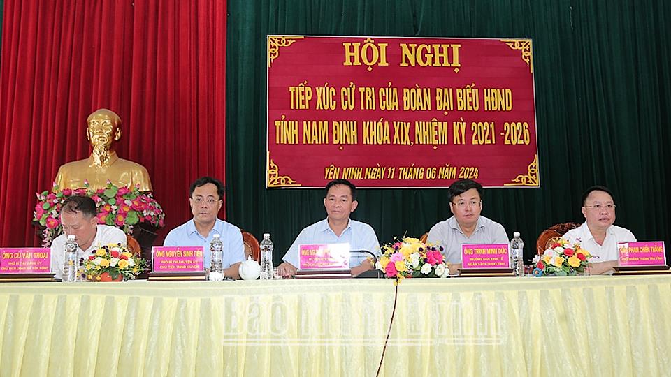Đồng chí Lê Quốc Chỉnh, Phó Bí thư Thường trực Tỉnh uỷ, Chủ tịch HĐND tỉnh, Trưởng đoàn Đoàn đại biểu Quốc hội tỉnh đã tiếp xúc cử tri huyện Nam Trực. Các đồng chí: Phạm Đình Nghị, Phó Bí thư Tỉnh ủy, Chủ tịch UBND tỉnh; Nguyễn Anh Tuấn, Ủy viên Ban TVTU, Bí thư Thành ủy, Chủ tịch HĐND thành phố Nam Định tiếp xúc cử tri thành phố Nam Định. Đồng chí Nguyễn Phùng Hoan, Ủy viên Ban TVTU, Phó Chủ tịch Thường trực HĐND tỉnh tiếp xúc cử tri huyện Ý Yên. Đồng chí Trần Anh Dũng, Ủy viên Ban TVTU, Phó Chủ tịch Thường trực UBND tỉnh tiếp xúc cử tri huyện Vụ Bản. Đồng chí Nguyễn Mạnh Hiền, Ủy viên Ban TVTU, Chủ nhiệm Ủy ban Kiểm tra Tỉnh ủy tiếp xúc cử tri huyện Trực Ninh. Các đồng chí: Đoàn Văn Hùng, Ủy viên Ban TVTU, Chủ tịch Ủy ban MTTQ Việt Nam tỉnh; Hà Lan Anh, TUV, Phó Chủ tịch UBND tỉnh tiếp xúc cử tri huyện Xuân Trường. Các đồng chí Ủy viên Ban TVTU: Phạm Thị Thu Hằng, Trưởng Ban Tuyên giáo Tỉnh ủy; Mai Văn Quyết, Giám đốc Sở Kế hoạch và Đầu tư tiếp xúc cử tri huyện Hải Hậu. Các đồng chí: Hoàng Nguyên Dự, Ủy viên Ban TVTU, Trưởng Ban Nội chính Tỉnh ủy; Mai Thanh Long, TUV, Phó Chủ tịch HĐND tỉnh tiếp xúc cử tri huyện Giao Thủy. Đồng chí Trần Minh Thắng, Ủy viên Ban TVTU, Trưởng Ban Dân vận Tỉnh ủy tiếp xúc cử tri huyện Nghĩa Hưng. Đồng chí Trần Lê Đoài, TUV, Phó Chủ tịch UBND tỉnh tiếp xúc cử tri huyện Mỹ Lộc. Cùng dự có lãnh đạo Uỷ ban MTTQ tỉnh; các vị đại biểu HĐND tỉnh khóa XIX; lãnh đạo Văn phòng Đoàn ĐBQH và HĐND tỉnh và các huyện, thành phố.