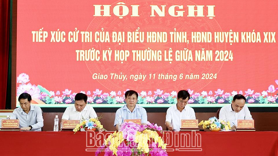 | Các đồng chí: Hoàng Nguyên Dự, Uỷ viên Ban TVTU, Trưởng Ban Nội chính Tỉnh uỷ; Mai Thanh Long, TUV, Phó Chủ tịch HĐND tỉnh và các đại biểu HĐND tỉnh tiếp xúc cử tri huyện Giao Thuỷ. |