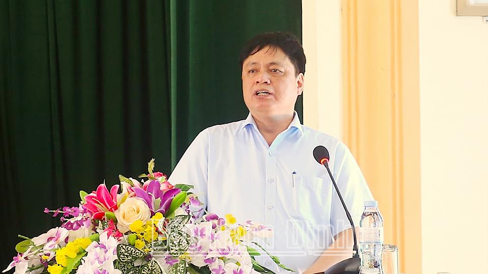 | Đồng chí Trần Minh Thắng, Ủy viên Ban TVTU, Trưởng Ban Dân vận Tỉnh ủy phát biểu tại hội nghị tiếp xúc cử tri huyện Nghĩa Hưng. |