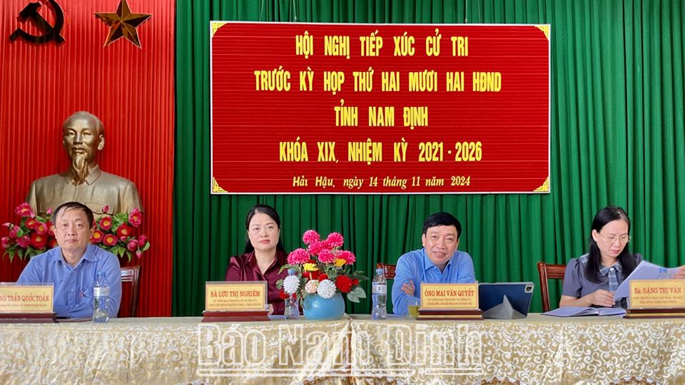 Cử tri huyện Hải Hậu kiến nghị HĐND tỉnh có cơ chế hỗ trợ kinh phí cho Ban công tác Mặt trận thôn, xóm, tổ dân phố sau sắp xếp, sáp nhập; tuyển dụng biên chế giáo viên mầm non; có kế hoạch mở rộng cầu Cồn và khu vực ngã tư hai bên cầu Cồn để giảm tắc nghẽn giao thông; bổ sung cán bộ công chức cho xã sau sáp nhập; điều chỉnh mức đóng bảo hiểm y tế đối tự nguyện phù hợp với thu nhập của người dân và giải quyết tình trạng đất nông nghiệp manh mún khi tỉnh thu hồi giải phóng mặt bằng thực hiện thi công Dự án xây dựng đường dây 500kV đoạn Nam Định - Phố Nối, Nhà máy Nhiệt điện Nam Định I, dự án đường dây điện 110kV Thịnh Long.