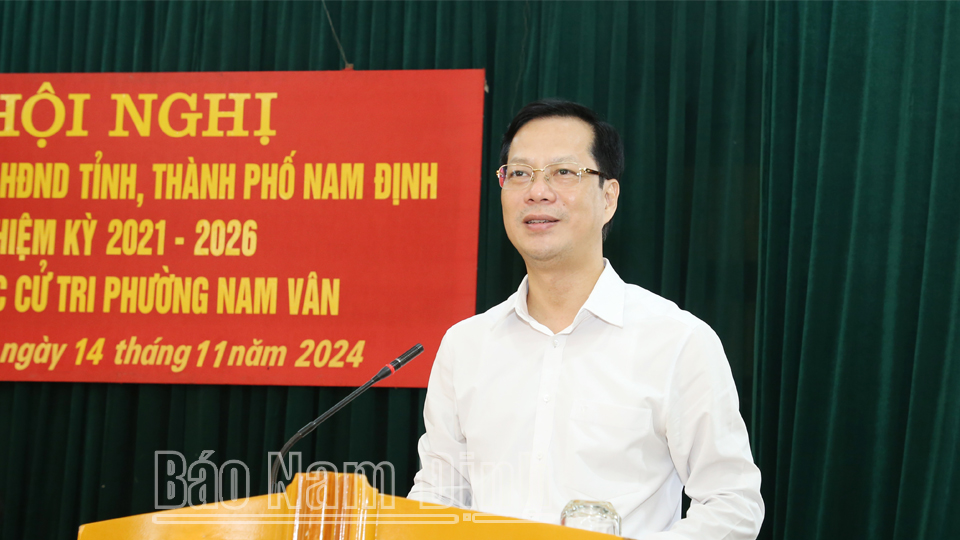 | Đồng chí Nguyễn Anh Tuấn, Ủy viên Ban TVTU, Bí thư Thành ủy, Chủ tịch HĐND thành phố Nam Định phát biểu tại hội nghị tiếp xúc cử tri phường Nam Vân. |
