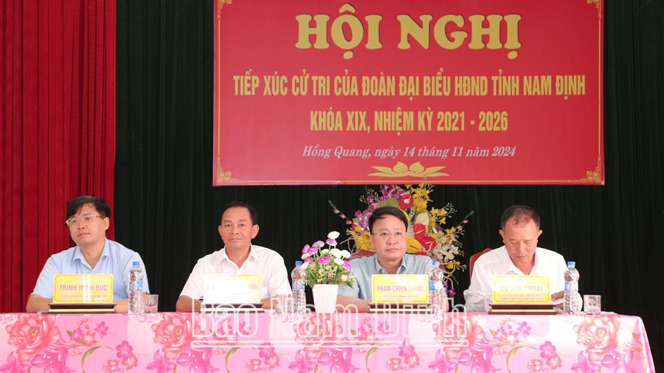 Đồng chí Lê Quốc Chỉnh, Phó Bí thư Thường trực Tỉnh uỷ, Trưởng đoàn Đoàn đại biểu Quốc hội tỉnh, Chủ tịch HĐND tỉnh đã tiếp xúc cử tri huyện Nam Trực. Các đồng chí: Phạm Đình Nghị, Phó Bí thư Tỉnh ủy, Chủ tịch UBND tỉnh; Nguyễn Anh Tuấn, Ủy viên Ban TVTU, Bí thư Thành ủy, Chủ tịch HĐND thành phố Nam Định tiếp xúc cử tri thành phố Nam Định. Đồng chí Nguyễn Phùng Hoan, Ủy viên Ban TVTU, Phó Chủ tịch Thường trực HĐND tỉnh tiếp xúc cử tri huyện Ý Yên. Đồng chí Trần Anh Dũng, Ủy viên Ban TVTU, Phó Chủ tịch Thường trực UBND tỉnh tiếp xúc cử tri huyện Vụ Bản. Đồng chí Trần Minh Thắng, Ủy viên Ban TVTU, Chủ tịch Ủy ban MTTQ tỉnh tiếp xúc cử tri huyện Nghĩa Hưng. Các đồng chí: Hoàng Nguyên Dự, Ủy viên Ban TVTU, Trưởng Ban Nội chính Tỉnh ủy; Mai Thanh Long, TUV, Phó Chủ tịch HĐND tỉnh tiếp xúc cử tri huyện Giao Thủy. Đồng chí Mai Văn Quyết, Ủy viên Ban TVTU, Giám đốc Sở Kế hoạch và Đầu tư tiếp xúc cử tri huyện Hải Hậu. Đồng chí Hà Lan Anh, TUV, Phó Chủ tịch UBND tỉnh tiếp xúc cử tri huyện Xuân Trường. Cùng dự có lãnh đạo Ủy ban MTTQ tỉnh; các vị đại biểu HĐND tỉnh khóa XIX; lãnh đạo Văn phòng Đoàn đại biểu Quốc hội và HĐND tỉnh và các huyện, thành phố.