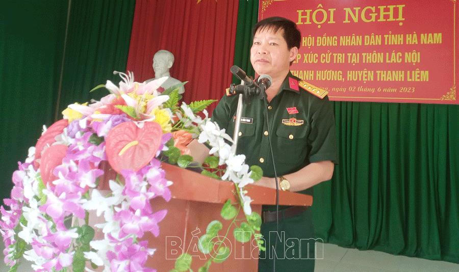 *Chuẩn bị cho kỳ họp thường lệ giữa năm 2023 của HĐND tỉnh, sáng 2/6, đoàn đại biểu HĐND tỉnh gồm các ông, bà: Phạm Thị Bích Ngọc, TUV, Chủ tịch Hội LHPN tỉnh; Đại tá Trịnh Hồng Phong, Phó Chỉ huy trưởng, Tham mưu trưởng Bộ CHQS tỉnh cùng các đồng chí lãnh đạo Uỷ ban Mặt trận Tổ quốc tỉnh, đại diện một số sở, ngành chức năng của tỉnh; đại biểu HĐND huyện Thanh Liêm đã về tiếp xúc cử tri tại xã Thanh Hương (Thanh Liêm).