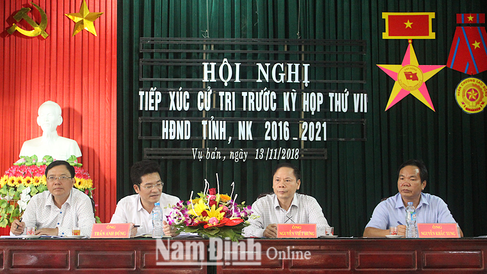 Các đồng chí: Nguyễn Viết Hưng, Ủy viên Ban TVTU, Phó Chủ tịch Thường trực HÐND tỉnh; Trần Anh Dũng, Ủy viên Ban TVTU, Giám đốc Sở KH và ÐT và các đồng chí trong tổ đại biểu HÐND tỉnh đã tiếp xúc cử tri huyện Vụ Bản.