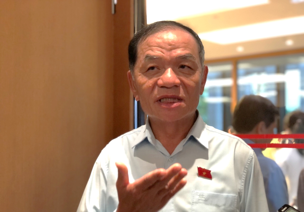 | Đại biểu Lê Thanh Vân (Đoàn ĐBQH tỉnh Cà Mau) trao đổi bên hành lang Quốc hội. |
