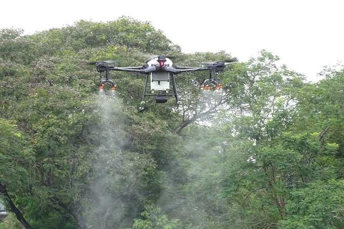 Máy bay không người lái trình diễn phun thuốc trừ sâu tại sân trường đại học Bách khoa TP HCM. Ảnh: Hà An.