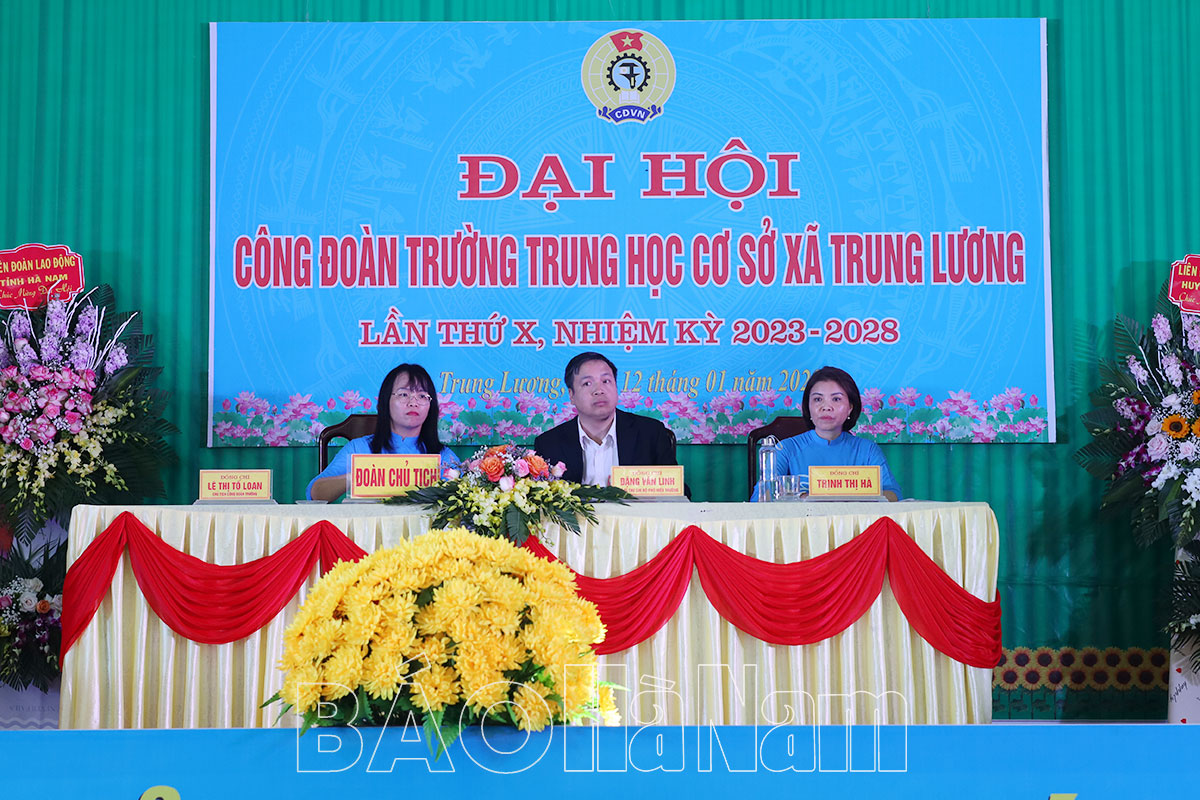 Sáng 12/1, Công đoàn cơ sở (CĐCS) Trường THCS Trung Lương (huyện Bình Lục) tổ chức Đại hội lần thứ X, nhiệm kỳ 2023-2028. Đây là đơn vị được Ban Thường vụ Liên đoàn Lao động huyện Bình Lục chỉ đạo tổ chức đại hội điểm khối hành chính sự nghiệp cấp cơ sở của huyện nhiệm kỳ 2023-2028.