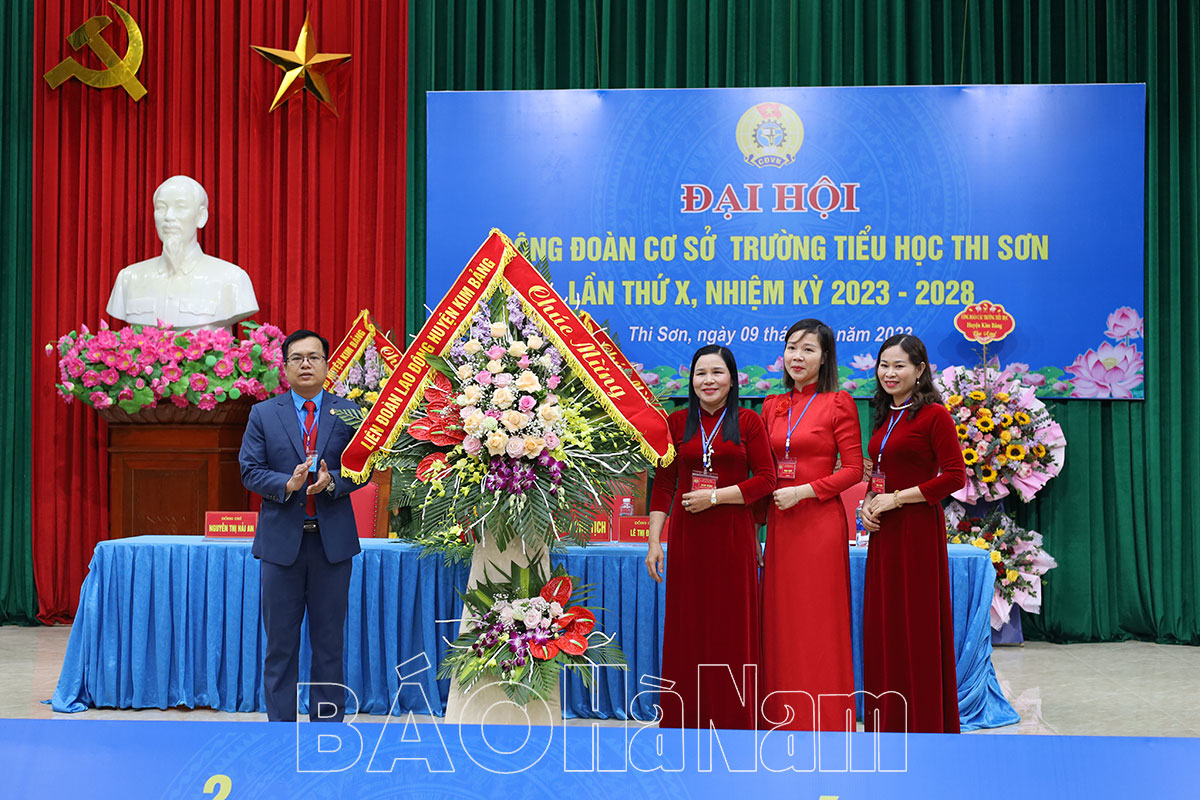 Lãnh đạo LĐLĐ tỉnh, LĐLĐ huyện Kim Bảng tặng hoa chúc mừng Ban Chấp hành CĐCS Trường Tiểu học Thi Sơn khóa X, nhiệm kỳ 2023-2028.