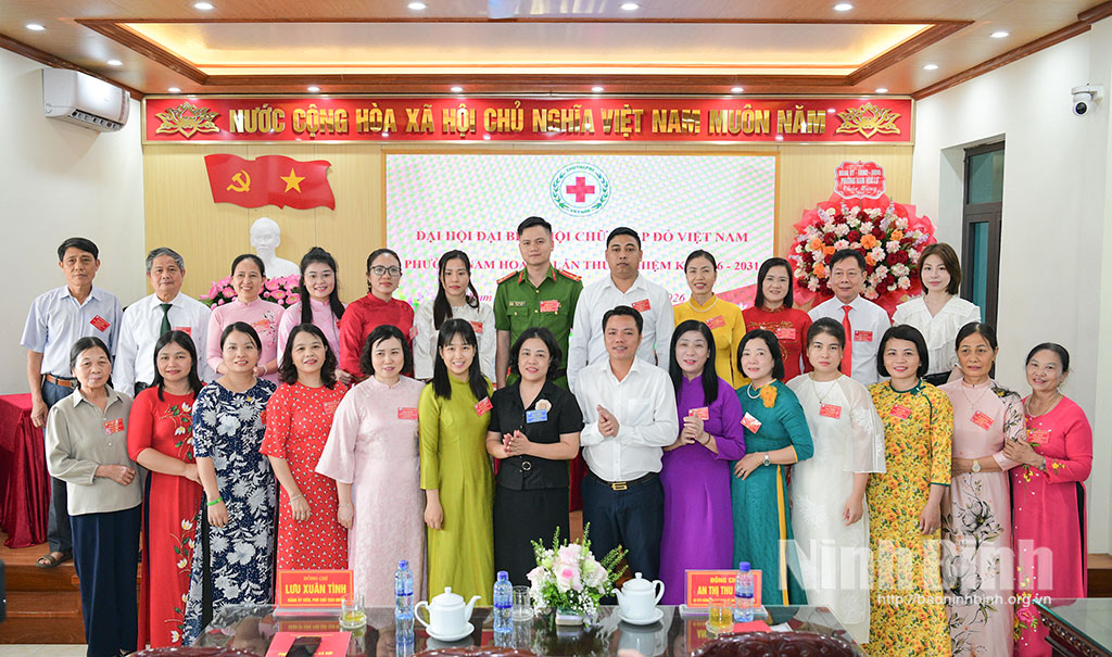Ban Chấp hành Hội Chữ thập đỏ phường Nam Hoa Lư nhiệm kỳ 2026 - 2031 và các đại biểu chụp ảnh lưu niệm.