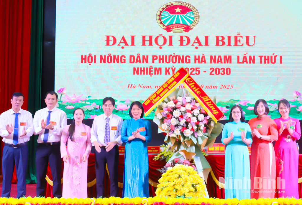 Lãnh đạo phường Hà Nam tặng hoa chúc mừng Đại hội đại biểu Hội Nông dân phường Hà Nam.