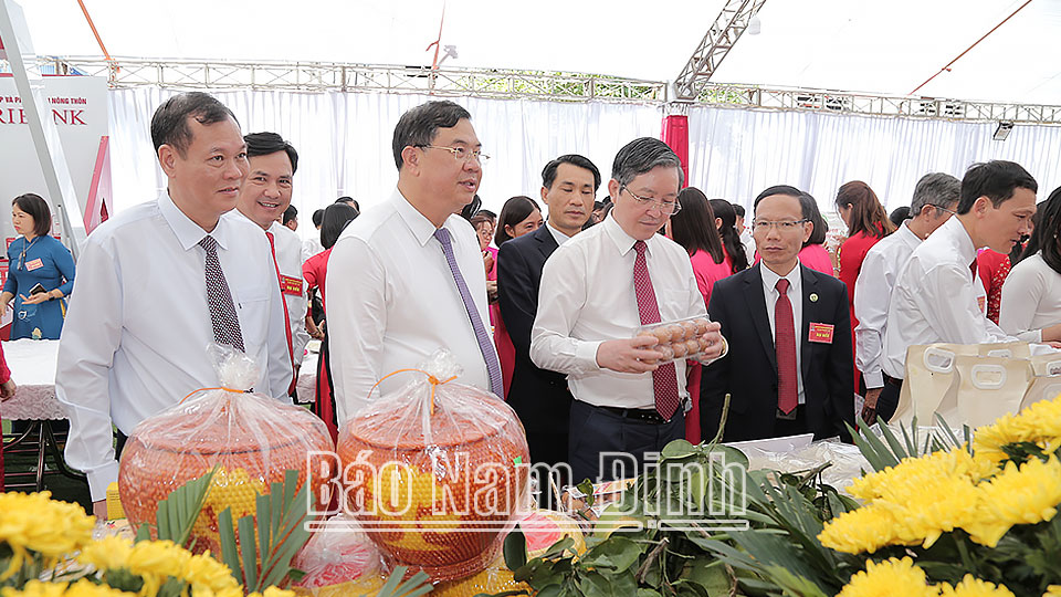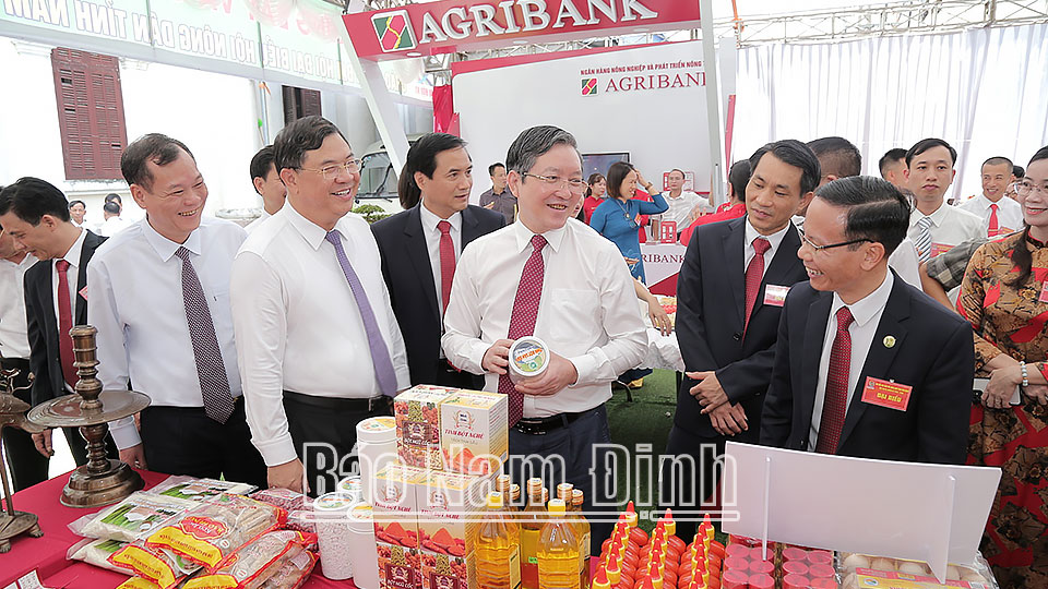 | Các đồng chí lãnh đạo Hội Nông dân Việt Nam và lãnh đạo tỉnh tham quan gian hàng nông dân tiêu biểu. |