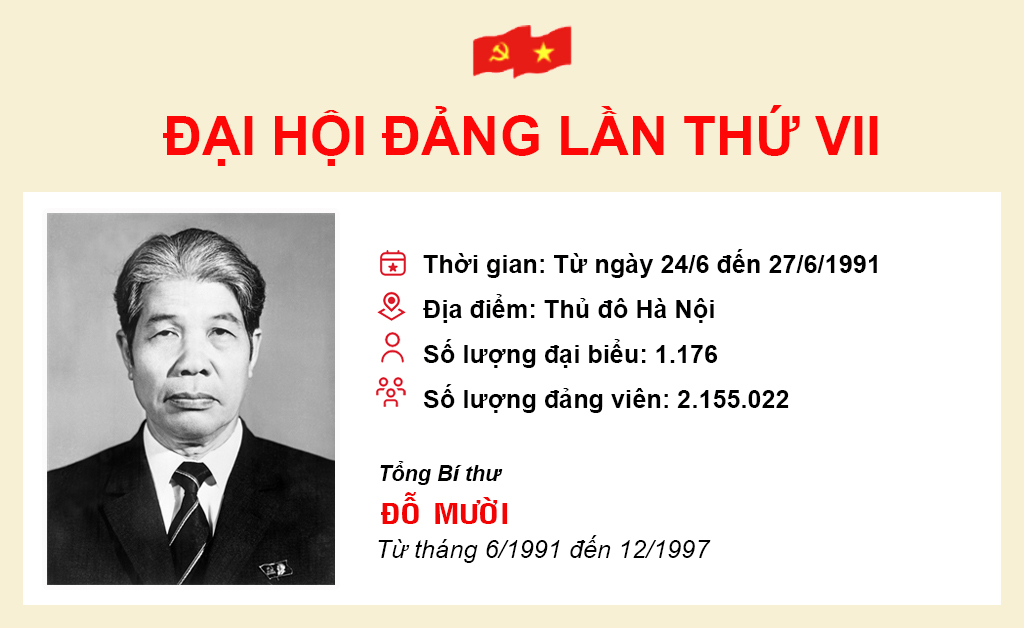 Đại hội Đảng toàn quốc lần thứ VII họp tại Hà Nội từ ngày 24-27/6/1991 với sự tham dự của 1.176 đại biểu, đại diện cho hơn 2 triệu đảng viên của Đảng.