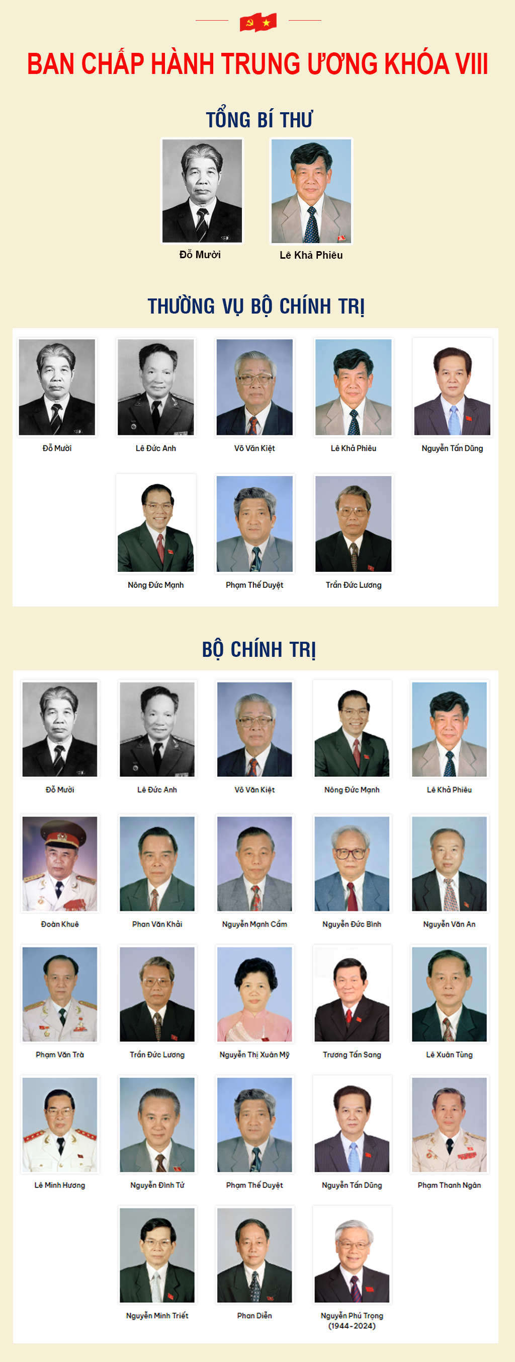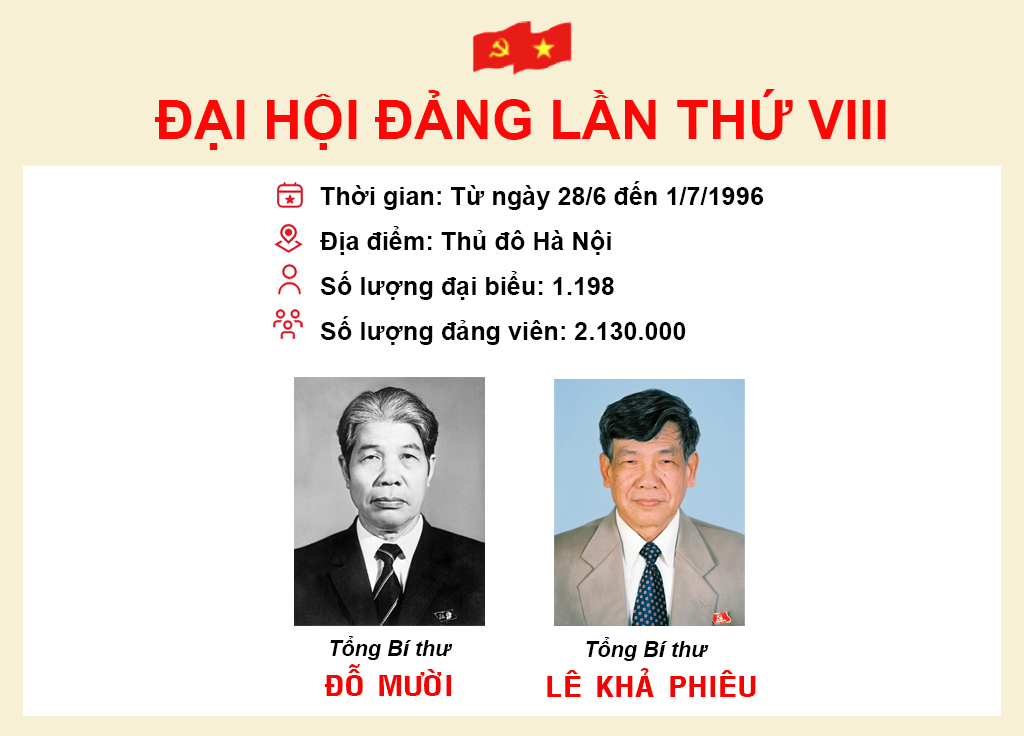 Từ ngày 28/6 đến 1/7/1996, Đại hội Đảng lần thứ VIII đã diễn ra tại Thủ đô Hà Nội với sự tham dự của 1.198 đại biểu đại diện cho 2,13 triệu đảng viên trong toàn Đảng.