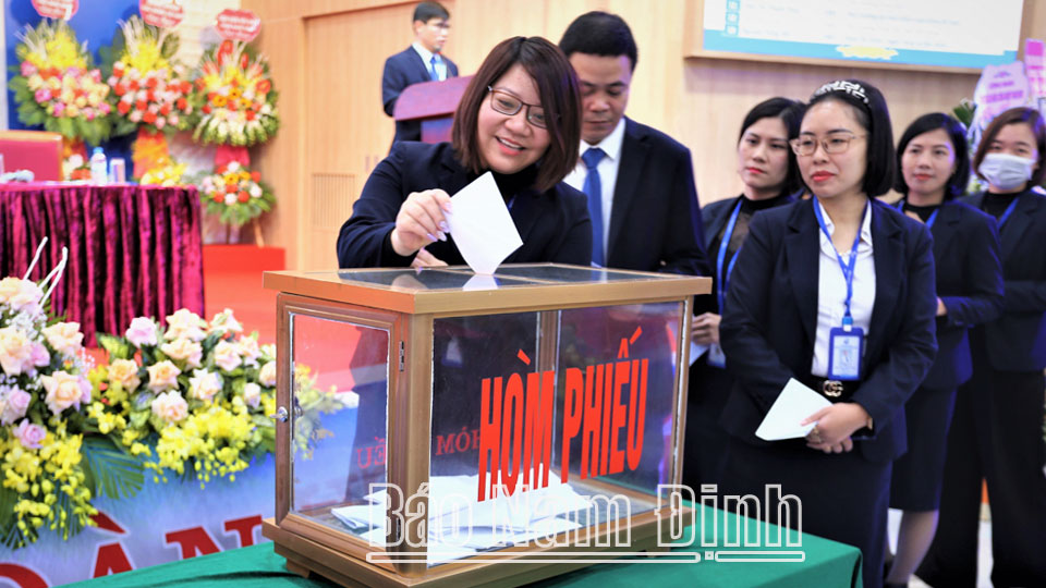 | Đoàn viên công đoàn Trường Đại học Kinh tế - Kỹ thuật công nghiệp cơ sở Nam Định tham gia bỏ phiếu bầu Ban chấp hành công đoàn nhiệm kỳ 2023-2028. |