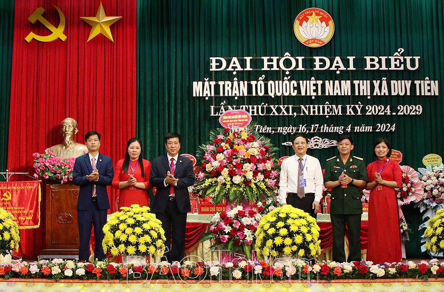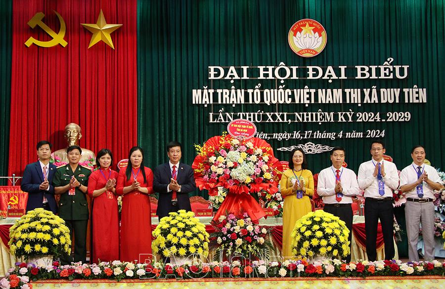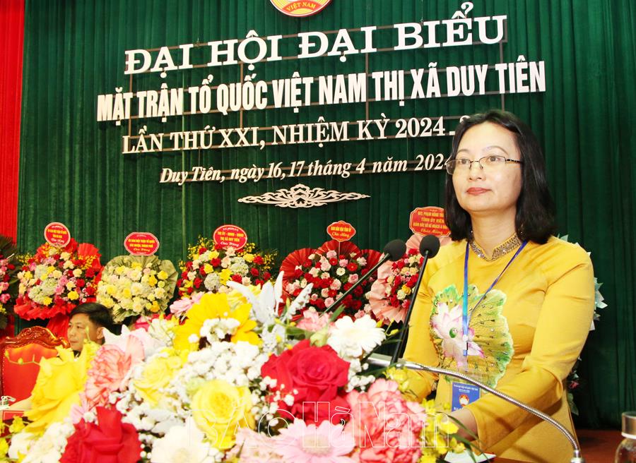 Phát biểu chỉ đạo tại đại hội, đồng chí Chủ tịch Ủy ban MTTQ tỉnh Trần Thị Ngân khẳng định: Nhiệm kỳ qua, mặc dù có những khó khăn, thách thức, song MTTQ các cấp thị xã Duy Tiên đã phát huy tốt vai trò, vị trí và nhiệm vụ của Mặt trận, nỗ lực phấn đấu, đổi mới nội dung, phương thức hoạt động, hướng mạnh về cơ sở, khu dân cư, đa dạng hóa các hình thức vận động, tập hợp, mở rộng khối ĐĐK toàn dân; tích cực vận động các tầng lớp nhân dân chấp hành tốt chủ trương, đường lối của Đảng, chính sách, pháp luật của Nhà nước.