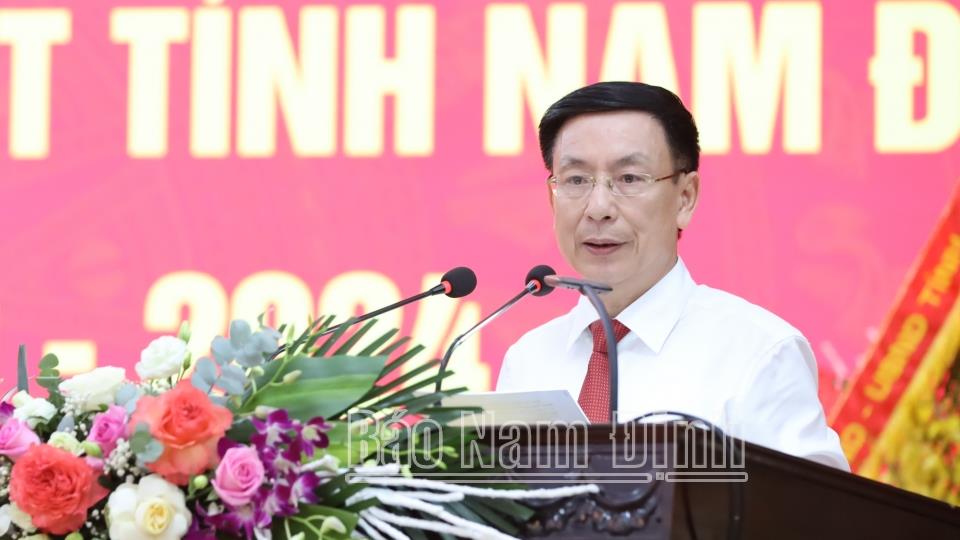 Phát biểu khai mạc Đại hội, đồng chí Bí thư Tỉnh ủy, Bí thư ĐUQS tỉnh Phạm Gia Túc nhấn mạnh: Những năm qua, tình hình kinh tế - xã hội của tỉnh luôn ổn định và có bước phát triển vững chắc. Năm 2023, tổng sản phẩm GRDP ước tăng khoảng 10,19%, cao nhất từ trước đến nay, cao hơn mức bình quân chung của cả nước; thu ngân sách Nhà nước đạt 10.452 tỷ đồng, đứng thứ 3/11 tỉnh, thành phố vùng Đồng bằng Sông Hồng, đứng thứ 6/63 tỉnh, thành phố trên cả nước. Trong 6 tháng đầu năm 2024, các chỉ tiêu về phát triển kinh tế - xã hội đều đạt và vượt so với cùng kỳ năm 2023. Tính đến tháng 5/2024, tỉnh đã có 32 xã đạt chuẩn nông thôn mới (NTM) kiểu mẫu, 197 xã đạt chuẩn NTM nâng cao, đã trình Trung ương thẩm định huyện Giao Thủy đạt chuẩn huyện NTM nâng cao năm 2023. Ngành Giáo dục và Đào tạo tỉnh luôn giữ vững tốp đầu của cả nước; an sinh xã hội được đảm bảo; QPAN được củng cố, tăng cường, trật tự an toàn xã hội được giữ vững. Những kết quả đạt được có đóng góp tích cực từ những hoạt động trong phong trào TĐQT của LLVT tỉnh. Đại hội TĐQT LLVT tỉnh giai đoạn 2019 - 2024 là sự kiện quan trọng nhằm khẳng định rõ vai trò, vị trí và sự phát triển mới của phong trào TĐQT của LLVT tỉnh đối với việc thực hiện thắng lợi nhiệm vụ quốc phòng, quân sự địa phương; xác định phương hướng, mục tiêu, biện pháp tiến hành công tác TĐKT và phong trào TĐQT của LLVT tỉnh, giai đoạn 2024 - 2029. Đại hội TĐQT LLVT tỉnh Nam Định giai đoạn 2019 - 2024 là dấu mốc quan trọng, khẳng định sự phát triển mới, tư duy mới của phong trào thi đua yêu nước, phong trào TĐQT, là sự biểu thị ý chí quyết tâm, niềm tin của cán bộ, chiến sĩ LLVT tỉnh nêu cao tinh thần đoàn kết, chủ động khắc phục mọi khó khăn, không ngừng sáng tạo, vững bước tiến lên lập nhiều thành tích mới, góp phần xây dựng Đảng bộ trong sạch, vững mạnh, LLVT tỉnh vững mạnh toàn diện “Mẫu mực tiêu biểu”, hoàn thành thắng lợi nhiệm vụ được giao, xứng đáng với truyền thống đơn vị Anh hùng LLVT Nhân dân.